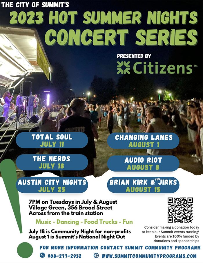 The City of Summit Department of Community Programs is announcing the schedule for summer movies and concerts on the Village Green, located at 356 Broad Street in Summit.