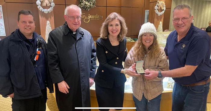 The Garwood and Cranford Knights of Columbus Councils held a joint Final Four fundraiser last year to help and assist Cranford Firefighter Rob Hurewitz and his family after hearing about the end of his career as a Cranford Firefighter due to medical issues. When Ellen Ramer of Martin’s Jewelers saw what we had done for Rob, she reached out to our Council to see how we could work together to help him some more. Ellen graciously donated a beautiful pair of diamond