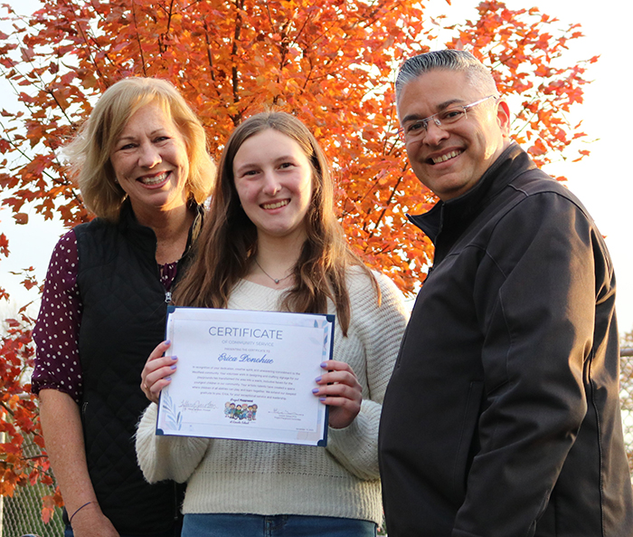 Dr. Raymond González and Mayor Shelley Brindle presented certificates of appreciation to Project Playground Young Designers Jillian Almendral, Sophia Basaldua, Mahika Dang, Erica Donohue, and Kai Patel. The certificates commend the young designers for “volunteer work in designing and crafting signage for our playgrounds that has transformed the area into a warm, inclusive haven for the youngest children in our community.”