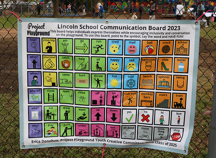 The renovated playground spaces include six new pieces of accessible equipment with special surfacing and pathways. Five Westfield High School students volunteered to design playground signage and communication boards with colorful symbols and illustrations to help children with limited language abilities express themselves.