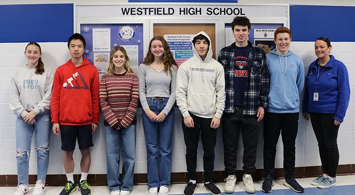 Seven WHS students earned perfect scores on recent ACTs. (L-R) Kaitlin Walsh, Charlie Hu, Chloe Katz, Avery Bell, Logan Feinstein, Samuel Braun, Ethan Selvers, WHS Principal Mary Asfendis