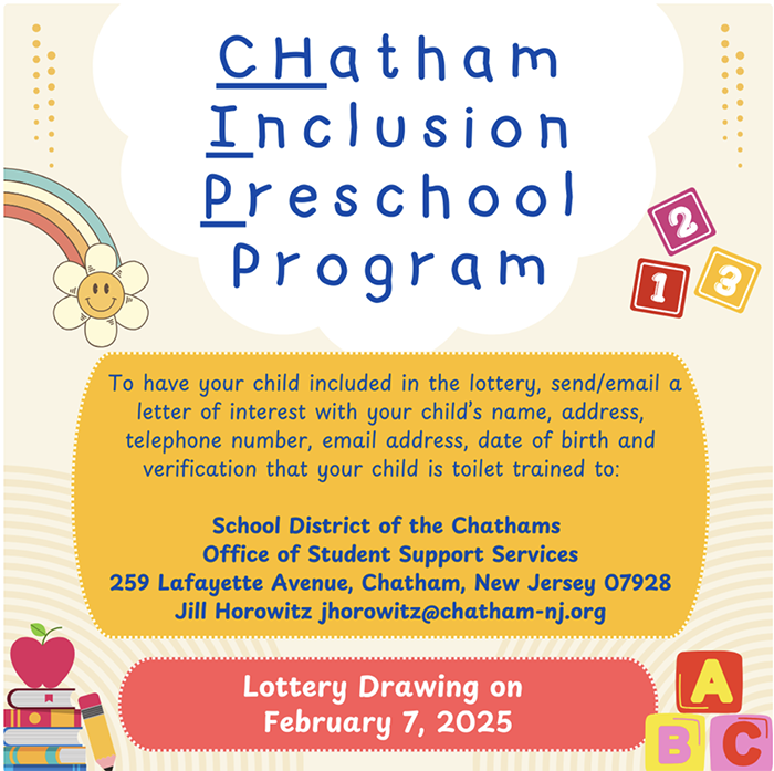 The School District of the Chathams is currently accepting letters from Chatham Borough and Chatham Township resident families interested in having their toilet trained 3 or 4 year olds attend our CHatham Inclusion Preschool Program. The lottery drawing for August 2025 enrollment will take place on February 7, 2025.