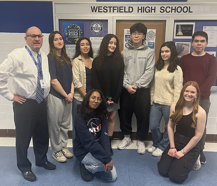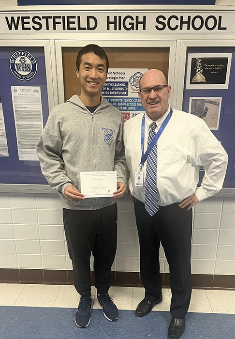 Fifteen WHS students were honored by the National College Board Recognition Program, which recognizes strong academic performances of students who belong to communities historically underrepresented on college campuses. (L-R) WHS Acting Principal William Loughran, Julianne Robinson, Sofia Basaldua, Eden Forbes (kneeling), Gabriella Mercado, Matthew Zheng, Anna Luchsinger, Madison Tacktikos (kneeling), Andres Philips Vazquez. Not pictured: Seth Bekker, Sebastian Carera, Jacob Correa, Niolas Lukis, Jorge Mendoza, Canya Nematadzira, Sean Rau.Westfield High School 12th grader Garrett Gao is a 2025 National Merit Finalist. Pictured here with WHS Acting Principal William Loughran.