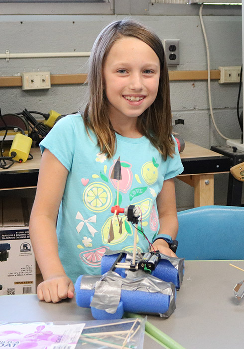 During the week-long, half-day sessions in July, STEM campers participated in four workshops among a selection of 10 courses, including Solar Boat Racing, Crash Test Cars, Wind-Powered Vehicles, Crime Scene Investigation, Stop Motion Animation, and Workshop to Flight.