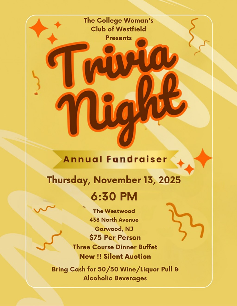 Get ready to put your knowledge to the test! The College Woman’s Club of Westfield will host its Annual Trivia Night on Thursday, November 13, from 6:30 to 9:30 p.m. at The Westwood, 438 North Avenue, Garwood.