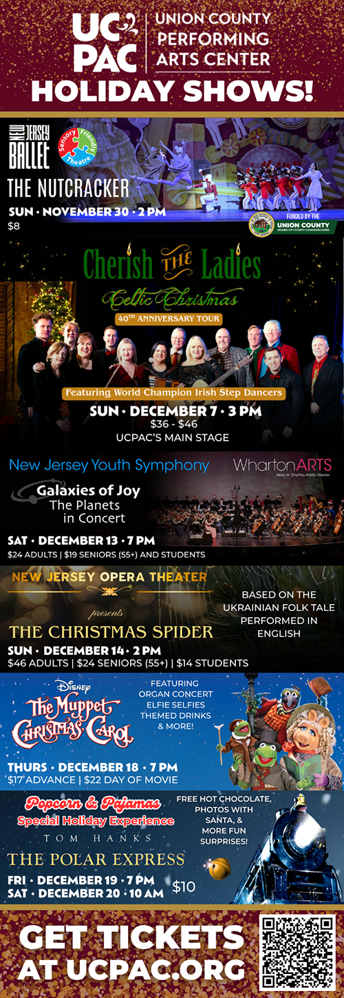 The season begins with a sensory-friendly performance of The Nutcracker by New Jersey Ballet, presented by the Union County Board of County Commissioners. Next, the internationally acclaimed Cherish the Ladies, celebrating 40 years of Celtic music and dance, returns for their third UCPAC performance—complete with world champion Irish step dancers and beloved holiday carols.